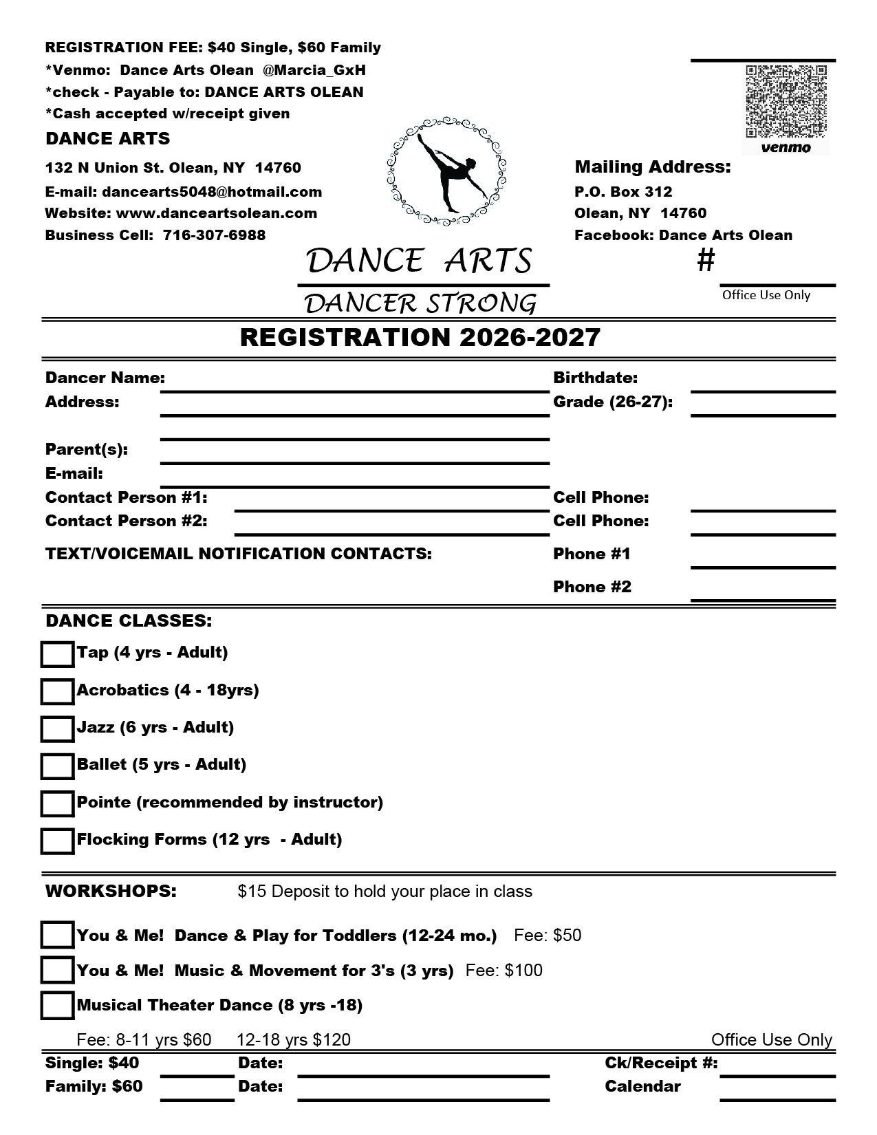 DANCE ARTS, located at 132 North Union Street, Olean, invites you to join us for our 44th Season which begins September 21, 2026 and concludes with our May 2027 Family Park Festival.